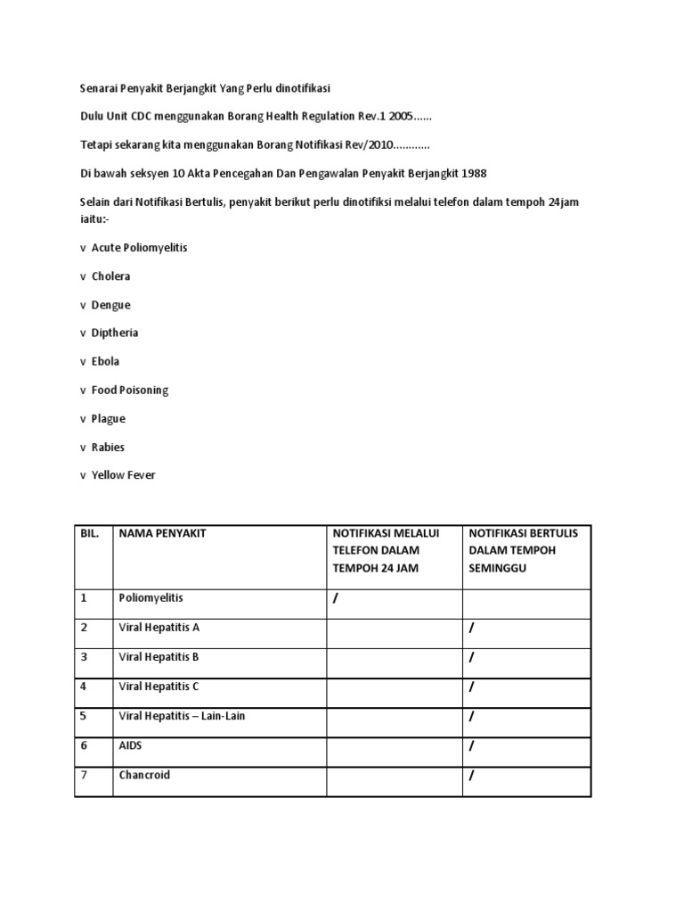 MOshims: Borang Notifikasi Penyakit Berjangkit 2019 from image.slidesharecdn.com Borang ini hendaklah diisi dengan terang dan jelas. Jenis penyakit, simptom, cara merebak. Meskipun ada yang tidak berbahaya, tapi dalam sesetengah keadaan, ia boleh menyebabkan penyakit berjangkit yang mengancam nyawa. 75 peratus penyakit berjangkit jenis baru adalah penyakit yang ditularkan dari haiwan ke manusia. Notifikasi penyakit berjangkit yang perlu dilaporkan. Borang notifikasi penyakit berjangkit rev 2010. Download ppt semakan draf 'panduan notifikasi penyakit berjangkit cdcis enotifikasi' group a/b/c/d modul Aspek utama yang perlu diberikan perhatian ialah kebersihan selain itu, wabak penyakit berjangkit seperti selsema burung, h1n1, dapat dilakukan dengan mengkuarantinkan dan mengasingkan pengidap.