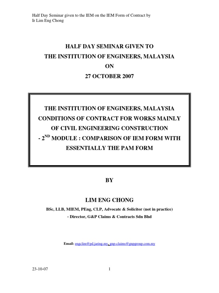However, for work of a similar type, certain conditions will apply for the vast majority of cases. Sales of digital publications and online training are unaffected. If you intend to get into a formal relationship with clients or shareholders, understanding the purpose of each contract and. Iem/jkr forms of contract do not have any provisions that the must submit his payment application for the engineer/so to 1 ir. Candidate enrolled for part i or part ii of the iem /bem graduate examination or examination of an overseas professional institution recognised by the council.