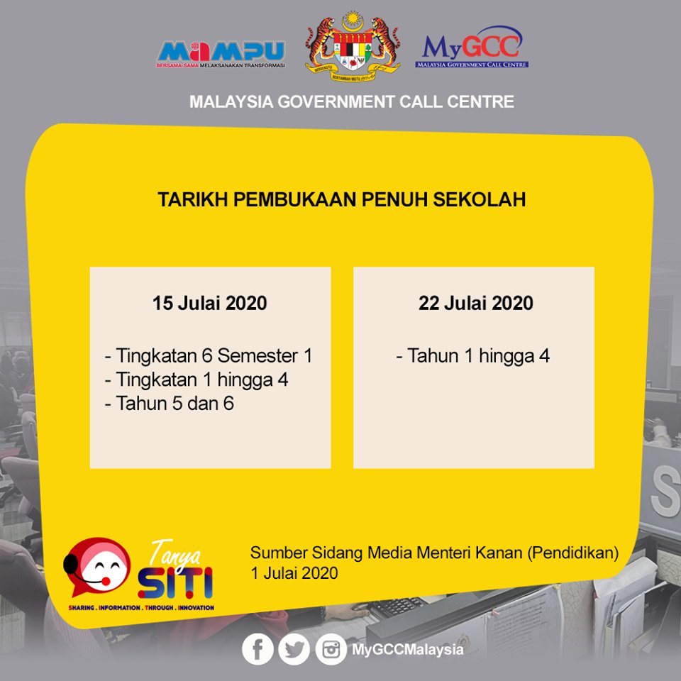 Pembukaan sekolah mulai 15 julai 2020.